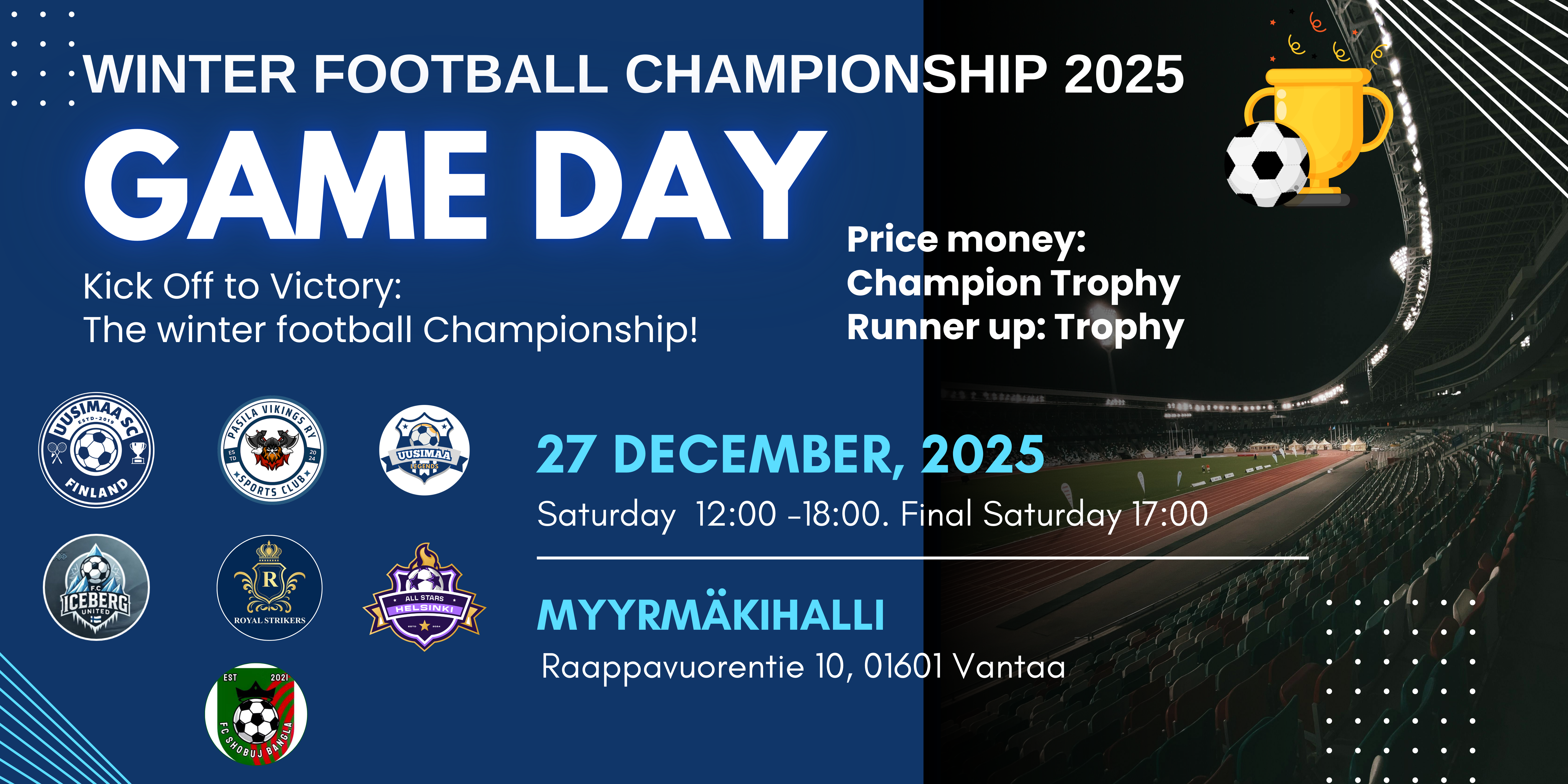 Top Headlines : Welcome to Winter Football Championship 2025 on 27.December.2025 at Myyrmäki Hall (Raappavuorentie 10, 01601 Vantaa)